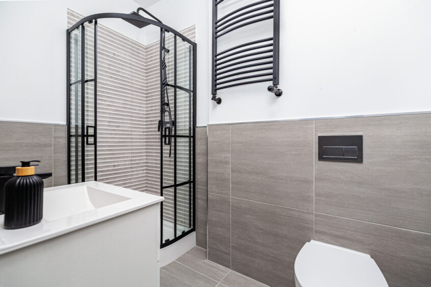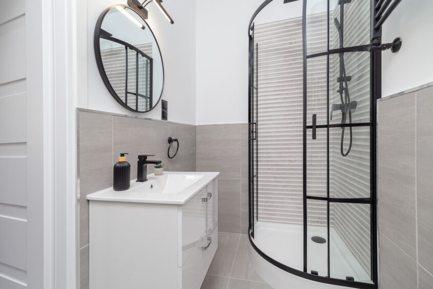 • Łazienka po gruntownym remoncie z prysznicem, szafka z umywalką, wc, lustro, miejsce na pralkę