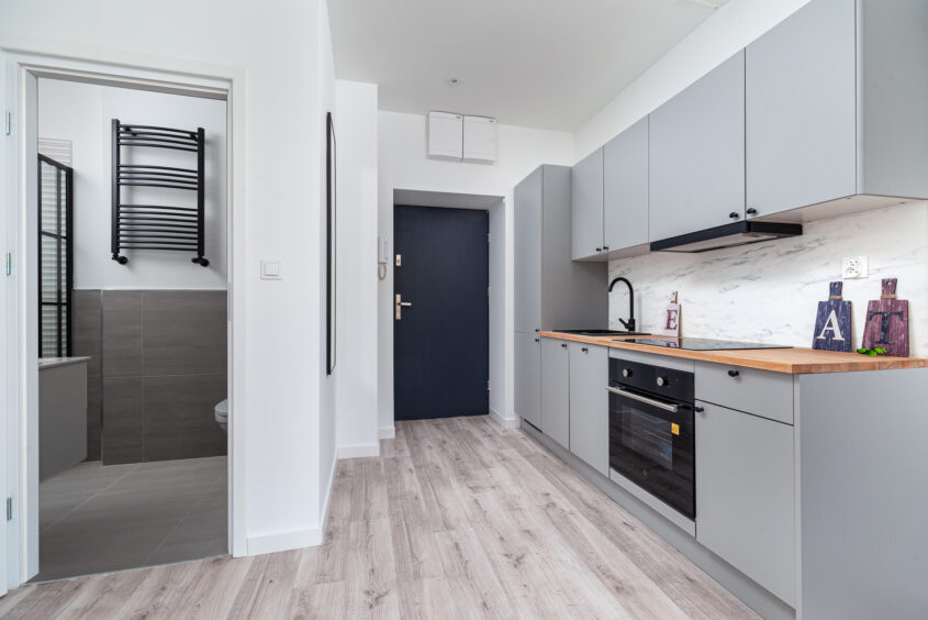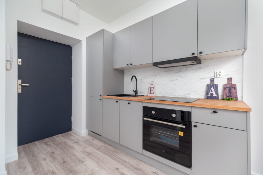 • Mieszkanie ma kompletnie umeblowaną kuchnię, wystarczy wstawić pralkę, kilka mebli i można zamieszkać