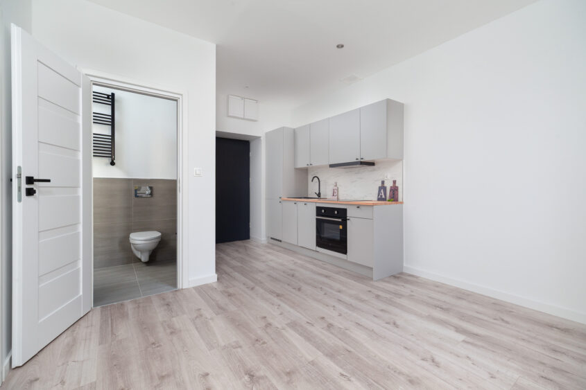 – Pokój z aneksem kuchennym z wejściem do sypialni i łazienki,